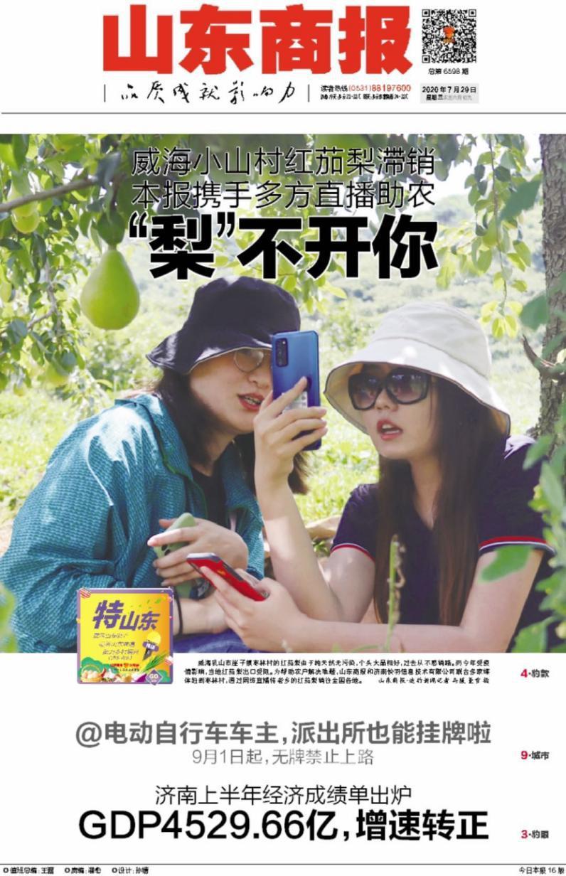 今年以來,山東商報已經(jīng)累計推出了10多場“特山東”品牌活動,推介了包括平陰泉水櫻桃、商河仁鳳西瓜等品牌在內(nèi)的農(nóng)產(chǎn)品。7月28日至31日,頂著高溫酷暑,山東商報記者團隊從濟南趕赴威海乳山崖子鎮(zhèn)棗林村、濰坊安丘市凌河鎮(zhèn)的百鵝疃村,在田間地頭做了兩場直播帶貨活動,為當?shù)販N的特色農(nóng)產(chǎn)品紅茄梨、牛奶小芋頭和紅芽嫩姜找出路。本次活動中,山東商報聯(lián)合多家媒體共同出擊,幫助當?shù)剞r(nóng)民售出總計20萬斤特色農(nóng)產(chǎn)品。